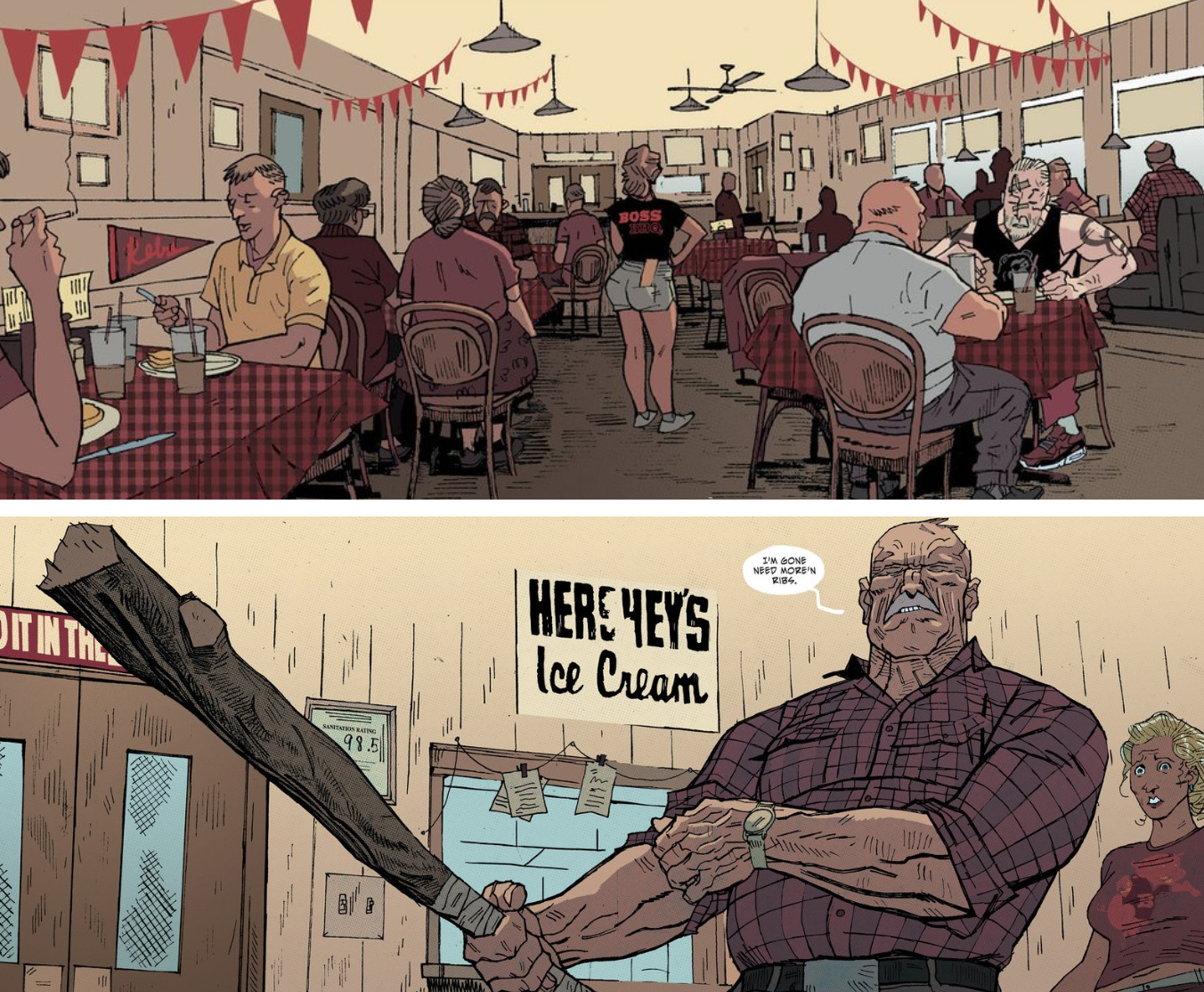 Dibujo: La verdad es que no conocía a Jason Latour, o igual si pero ahora mismo no lo ubico, y me ha gustado mucho. Creo que representa muy bien todo el tema rural del pueblo de Alabama. Lleva superbién la narrativa, no ves viñetas que sobren, todo resulta muy fluido. Y el estilo que tiene así como deslavazado con un toque cartoon, le queda que ni pintado a esta historia.