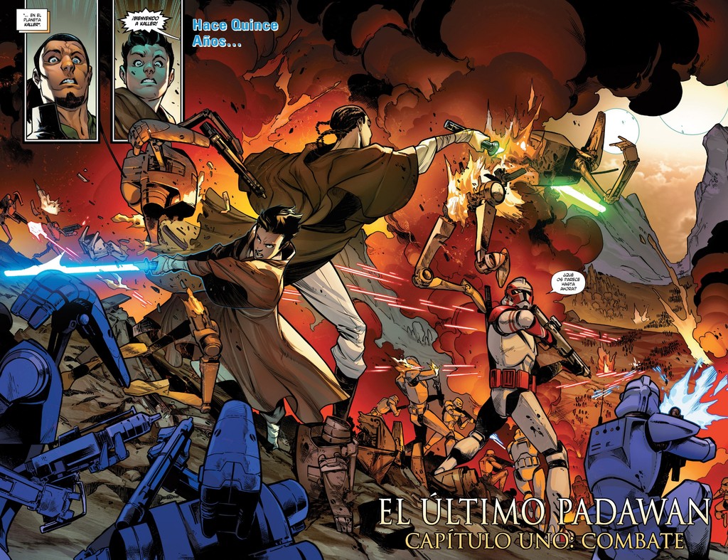 Comienza el cómic con un flash back de nuestro protagonista 14 años atrás, en plena Guerras Clon en el planeta Keller, lugar donde luchó con su maestra, al tener que volver por temas de trabajo, vamos, por ser traficante. Choca la camadería que se nos muestra entre los jedi y los soldados de la República, sabiendo todos sus nombres, compartiendo comida y bebida como si no hubiera diferencia entre ellos, cosa que es muy diferente a lo que aparece en la trilogía de las precuelas. También llama la atención el hecho de que la Maestra Depa Billaba comente a su padawan delante de dos mandos del ejército clon el hecho de que los Jedi no deberían haber tomado tanta parte en la guerra, estando en absoluto desacuerdo los soldados.